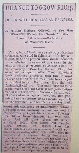 oben im Tempel neben dem kristallin-durchsichtigen Sarg mit ihrer Leiche zu verbringen, ihr Vermögen von 1 Million Dollar an. Eine Chance für jedermann, richtig reich zu werden. Jeden Tag wurde Essen gebracht. Auch Zeitungen und Bücher waren erlaubt. Täglich wurde für die Ausscheidungen ein neuer Eimer neben den Sarg gestellt. Wasser zum Waschen gab es nicht. Viele meldeten sich und versuchten es. Alle brachen nach wenigen Tagen ab. Einer schaffte es für einige Wochen, wurde dann verrückt und endete in der Klapsmühle.
